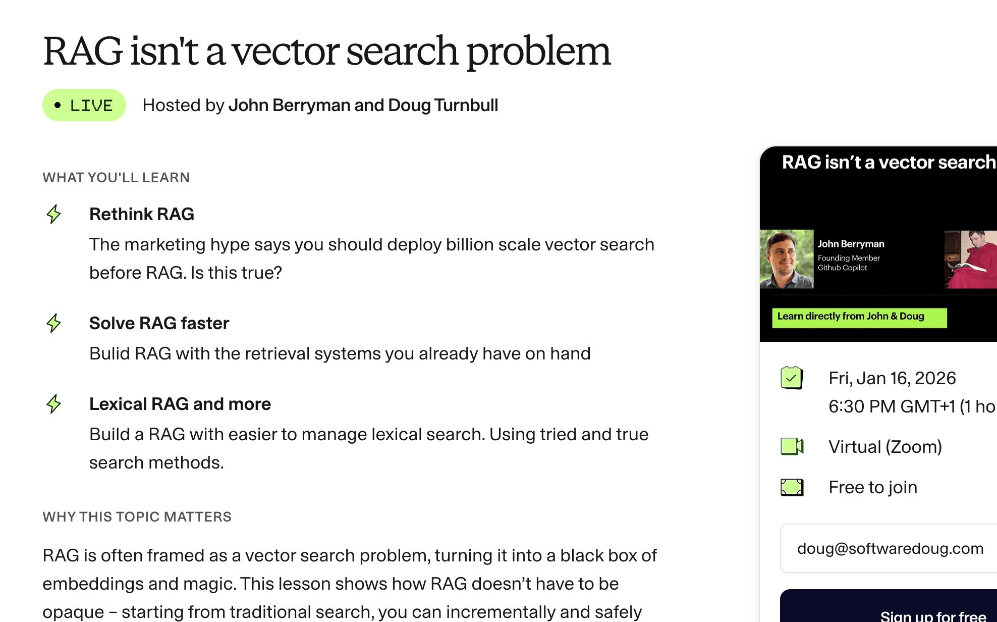 A reminder to come hear from John Berryman talk tomorrow: https://maven.com/p/93a8f0/rag-isn-t-a-vector-search-problem -Doug Events · Consulting · Training (use code search-tips) You're subscribed to Doug Turnbull's daily search tips where I share tips, blog articles, events, and more. You can always manage your profile: